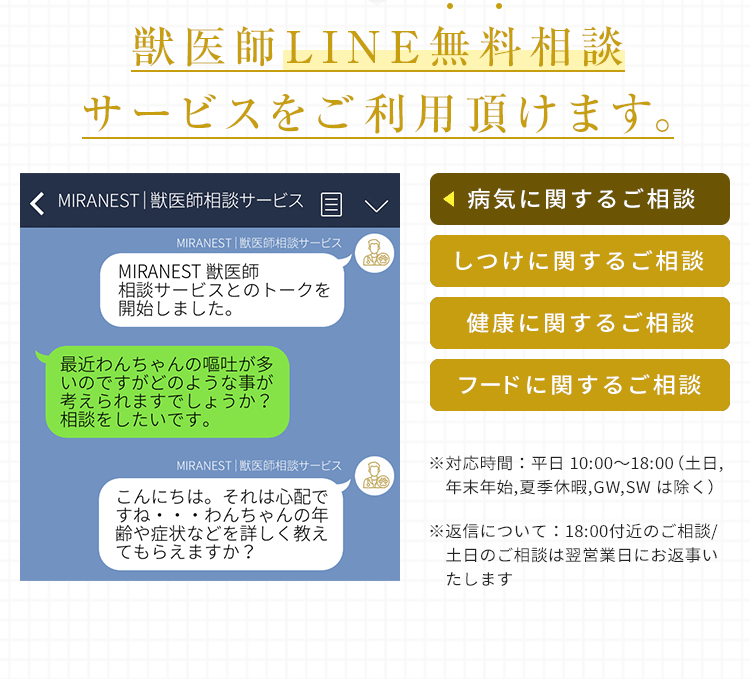 病気に関する相談から、しつけ、健康、フードまで獣医師にLINEで気軽に相談できるサービスです。